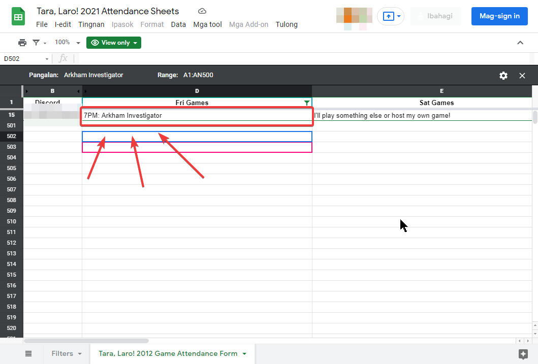 2. The link will take you back to the original sheet. In this example, we see that one person has signed up for Arkham Investigator. Cross-reference this sheet whenever you want to check how many players have signed up for a game! It updates automatically with each signup, so there's no wait time.
