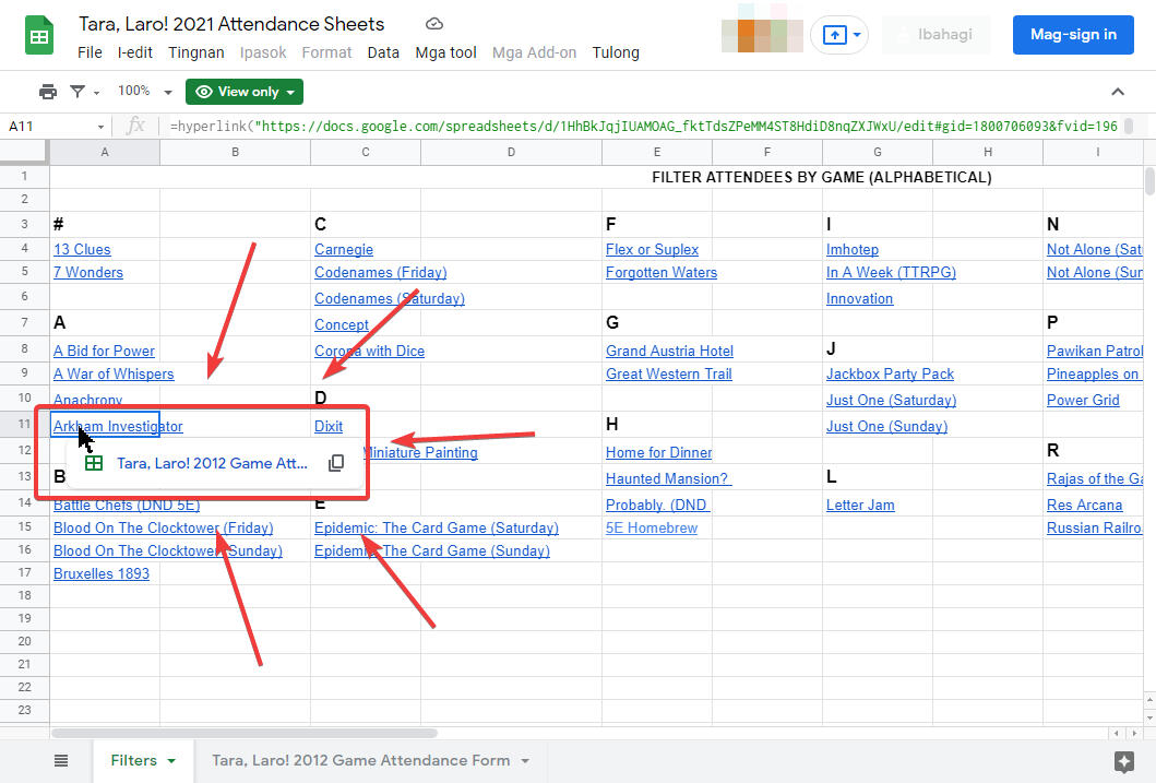 2. The games will be arranged in alphabetical order. Hover your mouse over the desired game and click the link that appears. In this example, we are filtering attendees for Arkham Investigator.